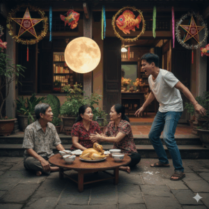 Trưa Trung thu, nắng đứng bóng như một con mắt không chớp. Đức ngồi bên bộ bàn gỗ mít, trước mặt là một…