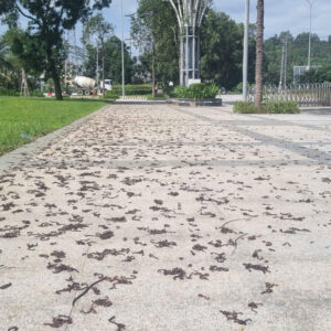 Hàng nghìn con giun đất bò ra khỏi lòng đất, lên nền gạch công viên của một khu đô thị ở phường Cẩm…