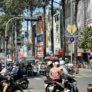Nhiều phương tiện, đặc biệt là xe máy, thay vì dừng đèn đỏ đúng vạch sơn, lại chọn dừng giữa đường dưới tán…