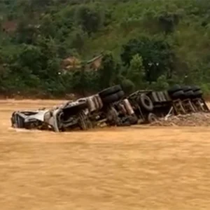 Nước đã rút hoàn toàn để lộ cầu tràn A Rông Trên, chiếc xe đầu kéo bị cuốn trôi cách cầu khoảng 100m,…