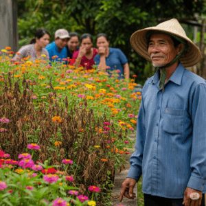 Làng tôi, Lộc An, nép mình bên dòng sông nhỏ, từ lâu nổi tiếng với nghề trồng hoa. Những luống cúc, vạn thọ,…