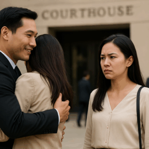 Người đàn ông bước ra khỏi cổng tòa án, gương mặt rạng rỡ một cách trâng tráo. Anh ôm chầm lấy nhân tình…