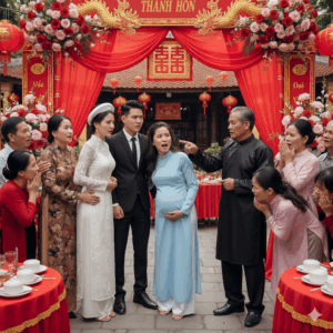 Ngày cưới, trong tiếng nhạc rộn ràng và pháo nổ, mọi người vừa chúc mừng vừa trầm trồ trước cô dâu chú rể…