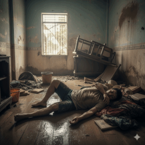Trận lũ quét qua bản nhỏ ven sông khiến cả vùng tan hoang. Đất bùn, cây cối, đồ đạc lẫn trong nước đục…