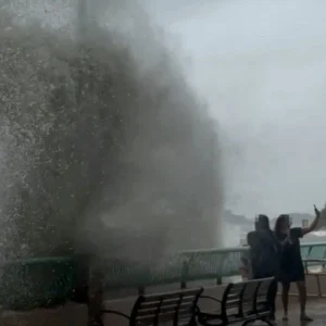 Hình ảnh 3 người đứng sát bờ biển để chụp ảnh tự sướng, bất chấp cảnh báo về siêu bão mạnh nhất thế…