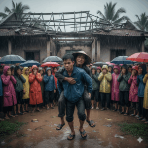 “Bố ơi…! Mới hôm qua thôi, con còn gọi điện về, bố mẹ vẫn cười bảo:– “Bão ngoài kia chứ có ảnh hưởng…