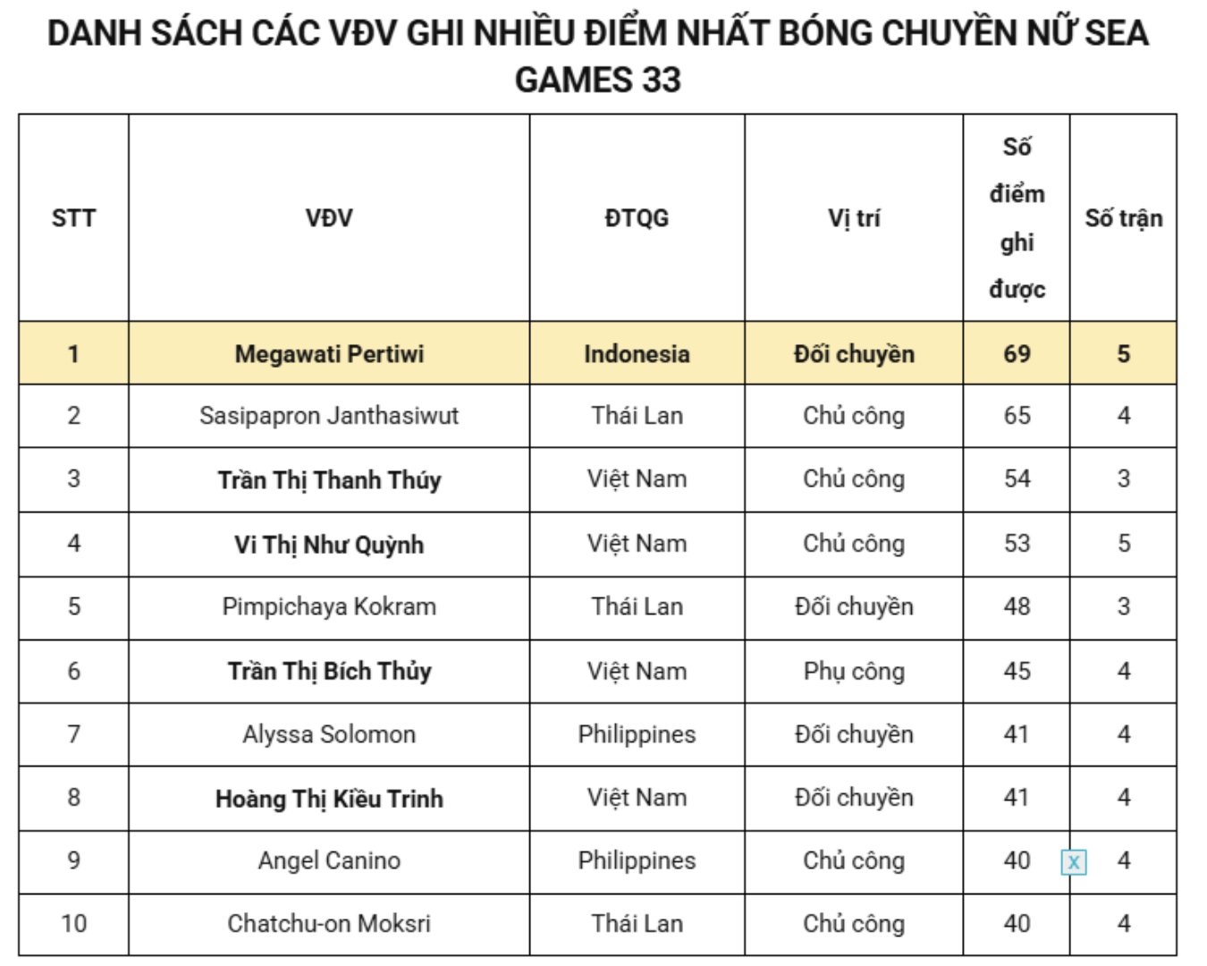 Dẫn đầu danh sách ghi điểm tại SEA Games 33 là ngôi sao số 1 Indonesia – Megawati Hangestri Pertiwi với 69 điểm.Đại diện ĐKVĐ Thái Lan – Sasipapron Janthasiwut đứng ngay sau với 4 điểm ít hơn.