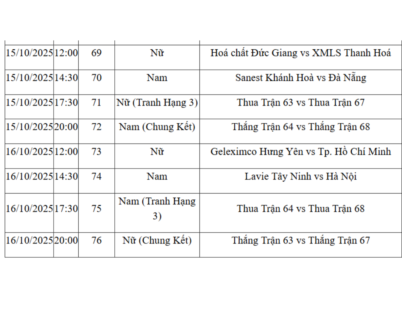 9/10, 12h00: Vietinbank 0-3 Xi măng Long Sơn Thanh Hóa (nữ)