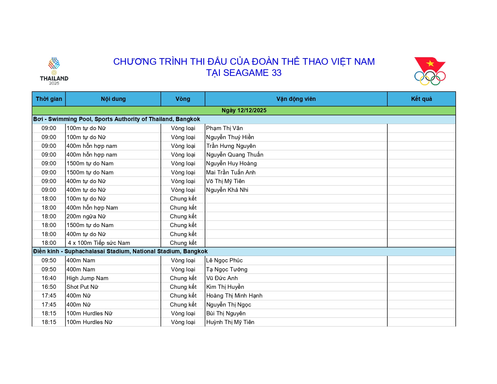 Lịch thi đấu SEA Games 33 hôm nay 12/12: Thêm ‘cơn mưa vàng’ News haianh — 12/12/2025 · 0 Comment VietNamNet cung cấp lịch thi đấu các môn thể thao tại SEA Games 33 đang được tổ chức tại Thái Lan, hôm nay ngày 12/12/2025.