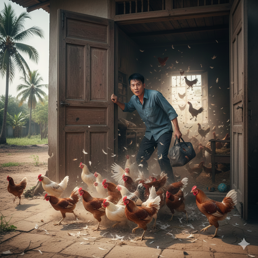Trời chiều ở miền quê nghèo, những tia nắng cuối ngày hắt xuống mái nhà lợp tôn cũ kỹ, nơi từng lưu giữ bao tiếng cười của một gia đình nhỏ. Hùng, chàng trai 28 tuổi, đứng tựa cửa nhìn đàn gà 70 con đang chạy rộn ràng quanh sân. Anh vuốt ve con gà trống to nhất rồi thở dài.