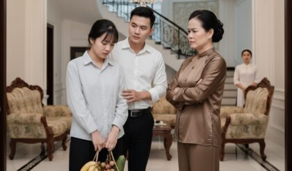 Bố đứng đó. Bên cạnh là một người phụ nữ. Tôi thoáng ngơ ngác. Rồi ánh mắt tôi trượt xuống… chiếc bụng – tròn, lớn – như đang cất giấu một bí mật không thể chối bỏ. Tôi lắp bắp, tim đập loạn: