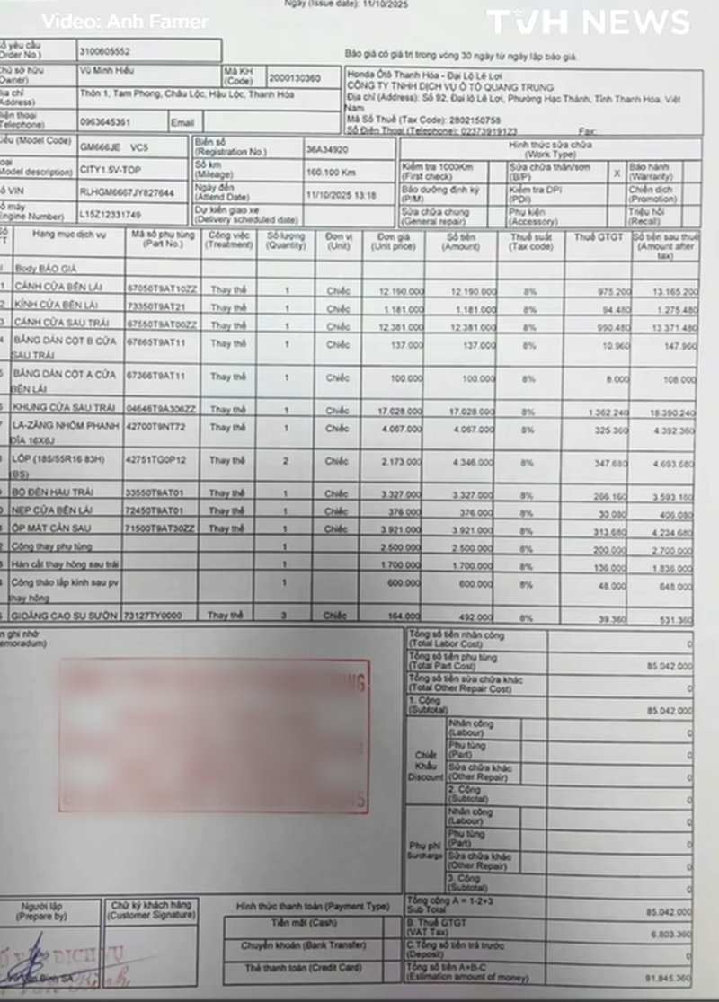 “Sau khi thương lượng, thỏa thuận, chủ xe ô tô nói đưa vào hãng tại Thanh Hóa để sửa chữa. Sau khi giám định, thiệt hại là 73 triệu đồng. Một thời gian sau, hóa đơn nhảy lên là 91 triệu đồng. Nhờ cộng đồng mạng giúp em với giá phụ tùng, dịch vụ như vậy có hợp lý chưa” – thông tin chia sẻ trên mạng xã hội.