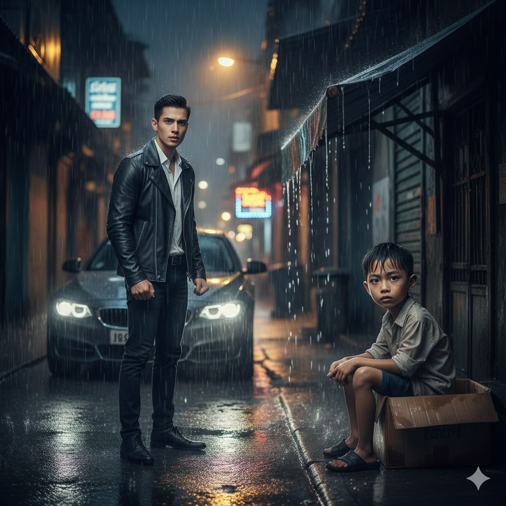 Một đứa bé chừng mười tuổi, người ướt như chuột lột, ngồi co ro bên cạnh một thùng carton. Đôi mắt thâm quầng, gương mặt gầy… nhưng những đường nét đó — trời ơi — giống Khang đến kinh ngạc.