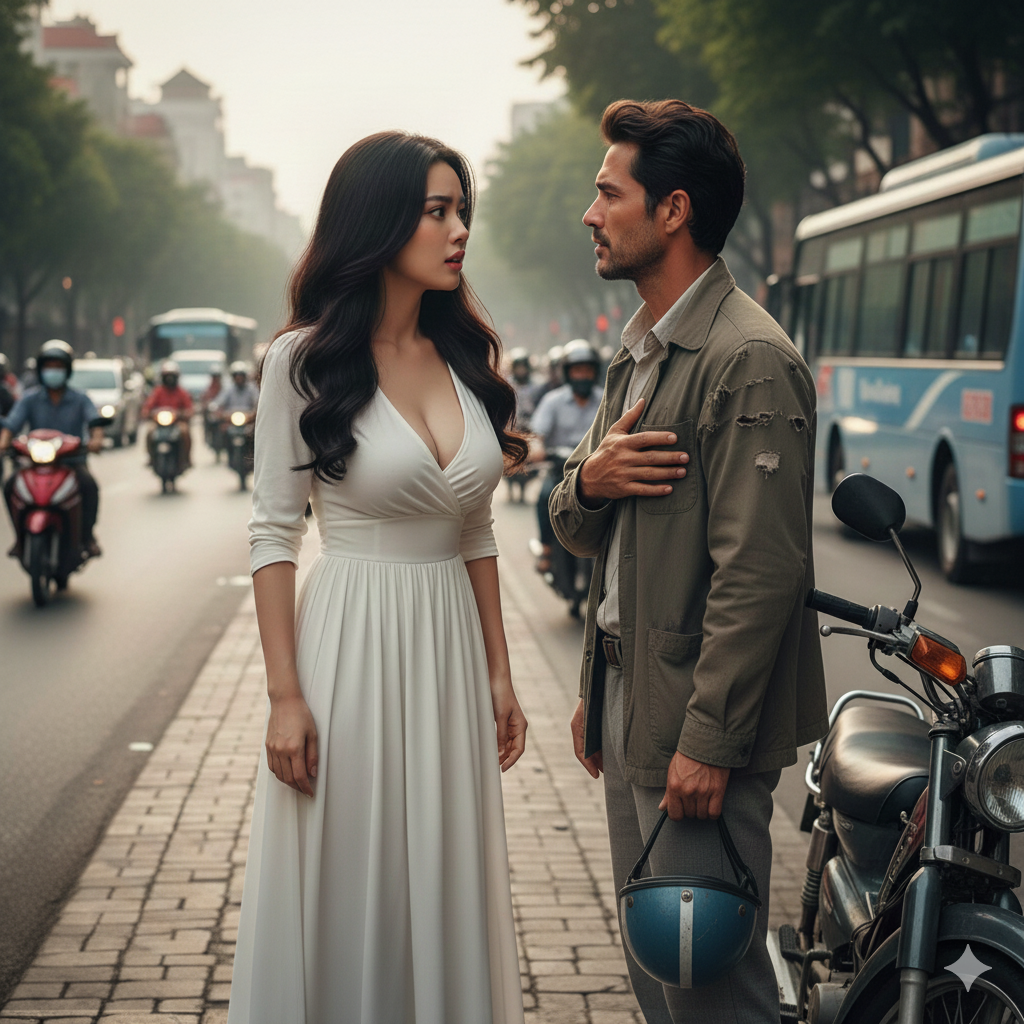 Người phụ nữ xuống xe, đứng đối diện Lâm. Lần đầu tiên, anh dám nhìn thẳng vào cô.