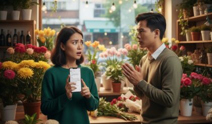 Hương run rẩy, cố giữ bình tĩnh. “Em… em chỉ định ăn gì đó. Anh bảo em ăn mì tôm mà.”