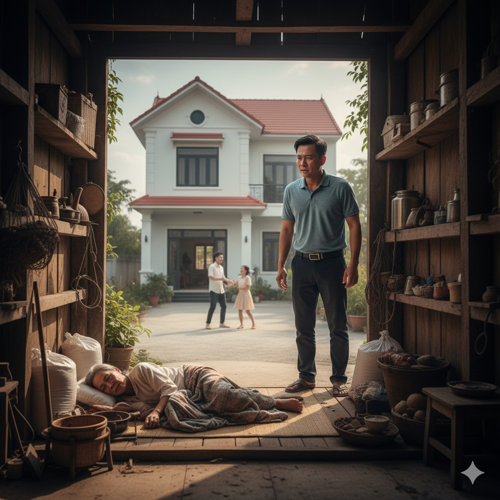 Tối hôm đó, sau bữa cơm mẹ nấu trong căn bếp tạm, tôi ngồi trước sân nhà kho, nhìn căn nhà mới sáng đèn. Lòng tôi rối bời. Tôi thương bố mẹ mình đến nhói cả tim, nhưng nhìn Lan và đứa bé, tôi cũng thấy một nỗi thương khác, kiểu thương dành cho người chẳng còn lựa chọn.