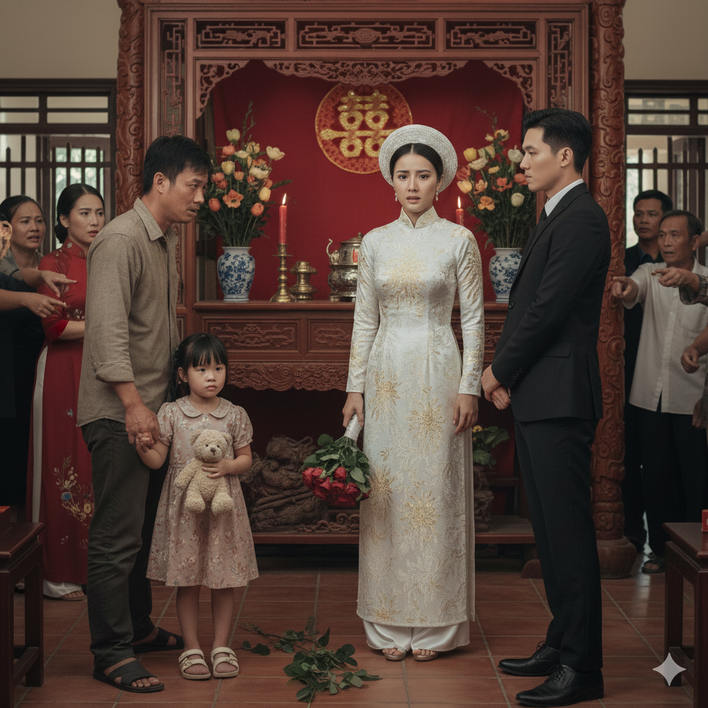 Tôi đứng giữa lễ đường, váy cưới trắng lấm tấm máu từ mũi con bé.