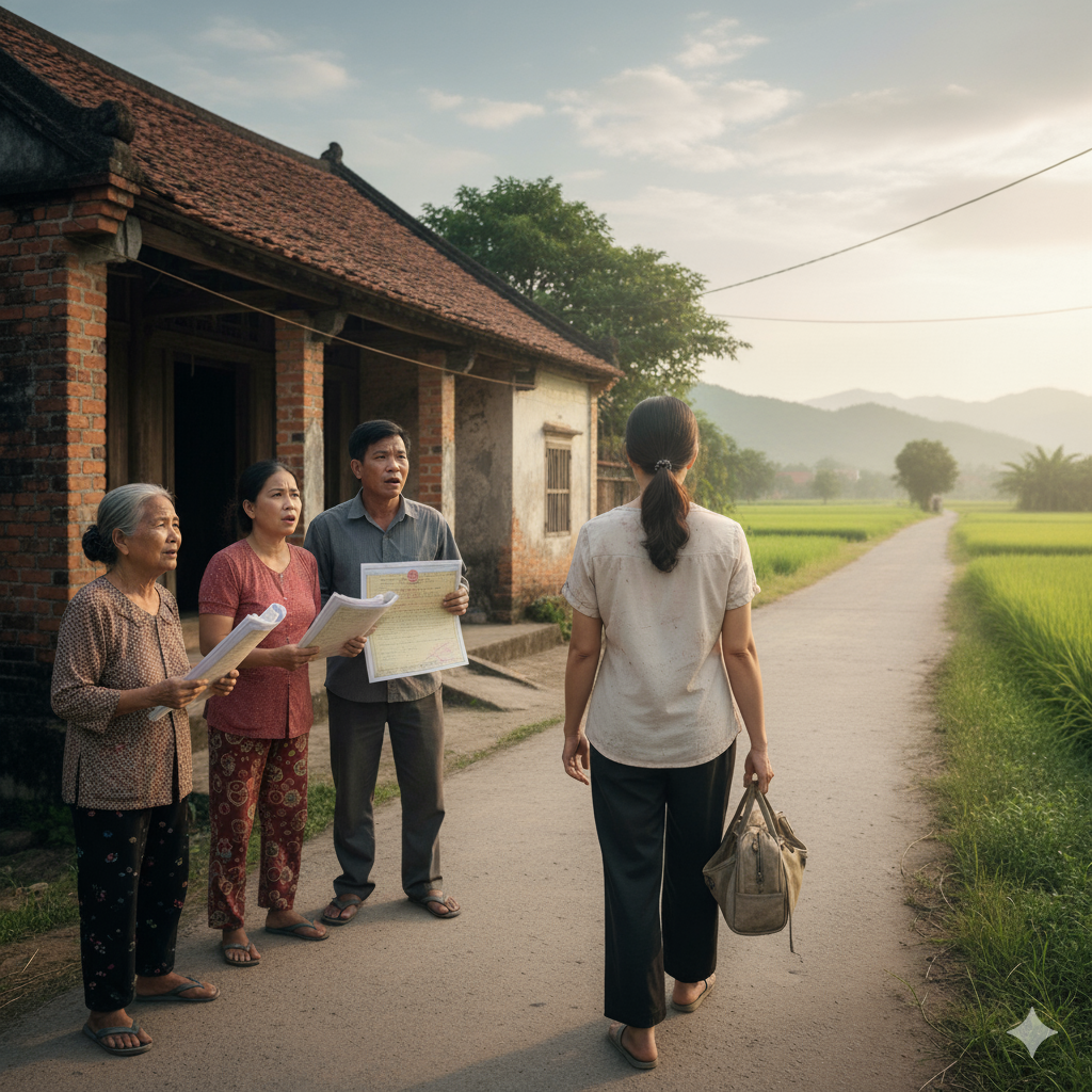 Một chiều tháng Hai, tôi đang phơi quần áo thì thấy ba anh em nhà chồng tụ tập trong phòng khách. Mẹ chồng đặt trước mặt mỗi người một xấp giấy đỏ. Tôi đoán ngay: sổ đỏ. Những mảnh đất bà tích góp cả đời.