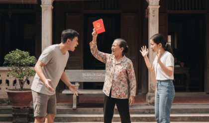 Bố đứng chết lặng. Mẹ kế từ phía sau bước ra, vừa thấy tờ giấy đỏ dấu, mặt bà tái mét.