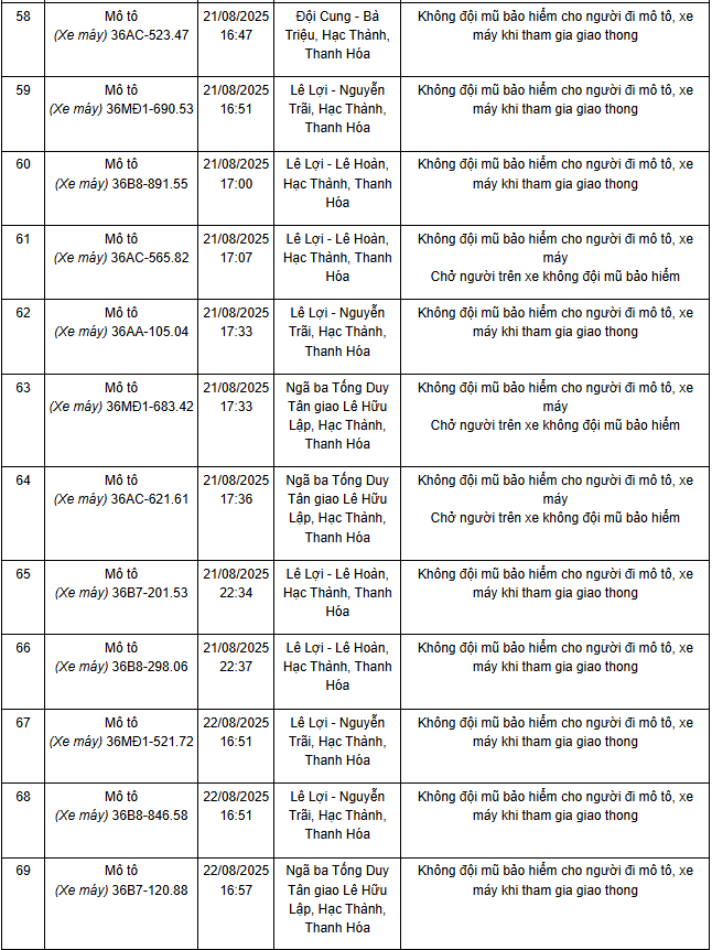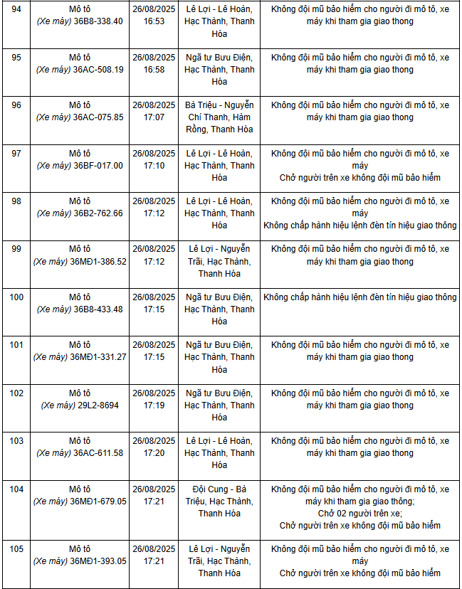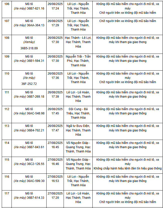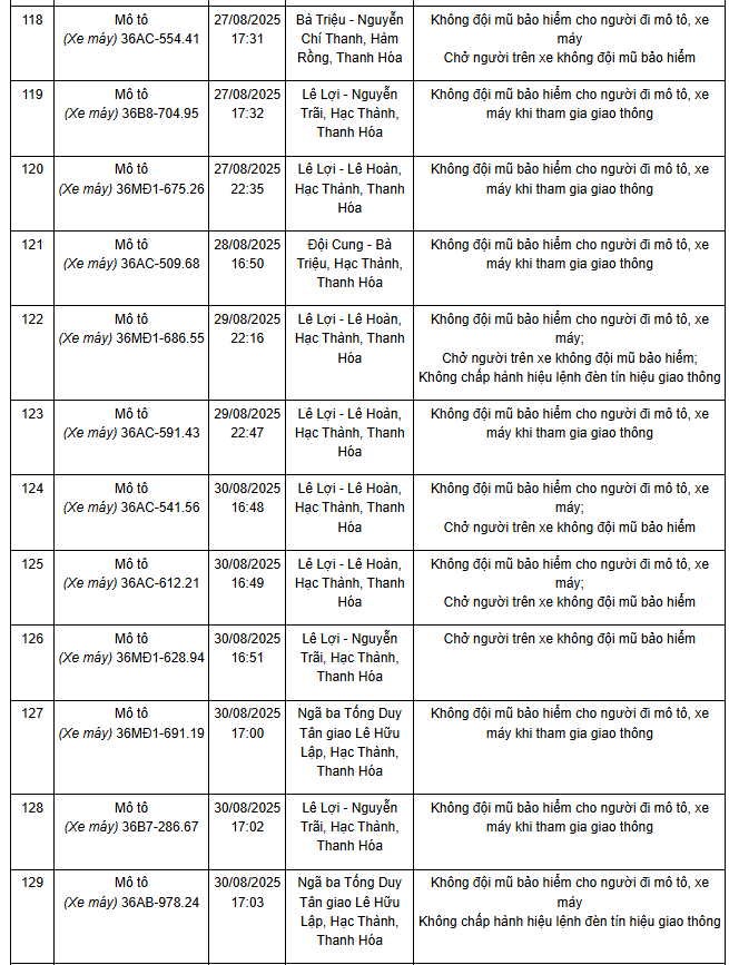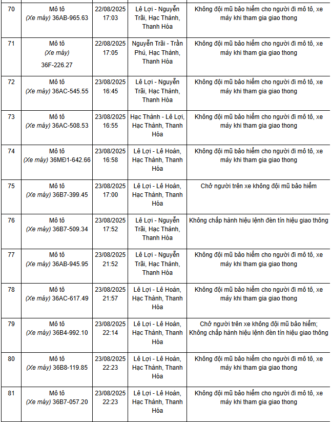 Ngày 16/9, Phòng Cảnh sát giao thông (CSGT), Công an tỉnh Thanh Hoá thông báo danh sách các phương tiện vi phạm về trật tự an toàn giao thông qua hệ thống camera giám sát an ninh trật tự, an toàn giao thông trên địa bàn, từ ngày 21/8/2025 đến ngày 31/8/2025. Trong đó, có 87 trường hợp xe máy vi phạm.
