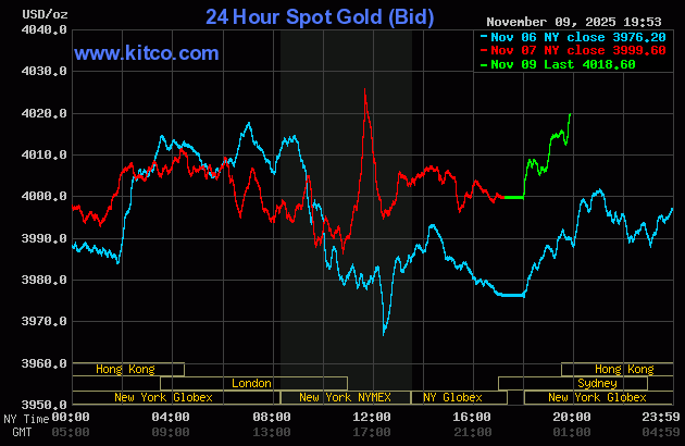 Tại thời điểm khảo sát sáng 10/11, giá vàng giao ngay trên thị trường thế giới đạt 4.018 USD/ounce, tăng 19 USD so với chốt phiên liền trước.