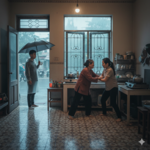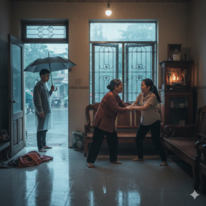 Về nhà sớm ngày mưa, chồng thấy mẹ chồng đang nắm tay vợ kéo vào góc nhà, ánh mắt cả hai căng thẳng…