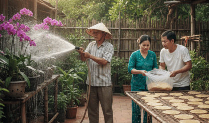 Cô bé Mai, 10 tuổi, đứng run rẩy trước quầy tạp hóa bà Phấn. Trên tay Mai là hai đứa em sinh đôi mới 2 tuổi, bám chặt hai bên, mặt lấm lem, bụng lép xẹp vì đói.